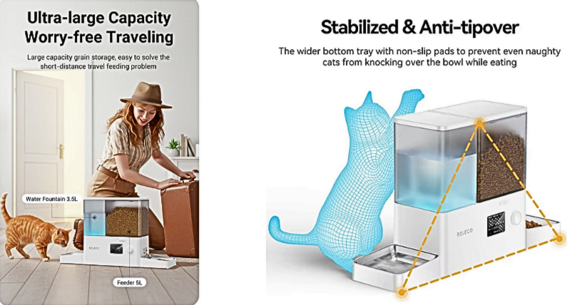 O Comedouro e Bebedouro Automático Inteligente Rojeco foi desenvolvido para oferecer praticidade, precisão e bem-estar máximo para cães e gatos de pequeno e pequeno/médio porte.