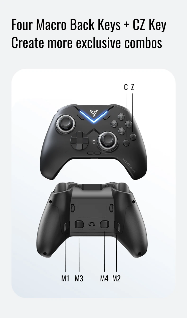 Na parte Frontal do controle possui 2 Botões Macro e na parte Traseira possui 4 botões com um total de 6 botões configuráveis (macros), totalmente personalizáveis via software FlyDigi ou diretamente em jogos compatíveis. Conta também com Gatilhos que podem alternar entre modo linear (para jogos de corrida, por exemplo) e modo de microinterruptor (para resposta rápida em jogos de tiro, FPS etc), além de terem motores de vibração integrados (impulse triggers) que fornecem feedback tátil em jogos compatíveis, Portanto o Vader 4 Pro oferece personalização avançada tanto nos analógicos (tensão) quanto nos gatilhos (modo de operação e vibração.
