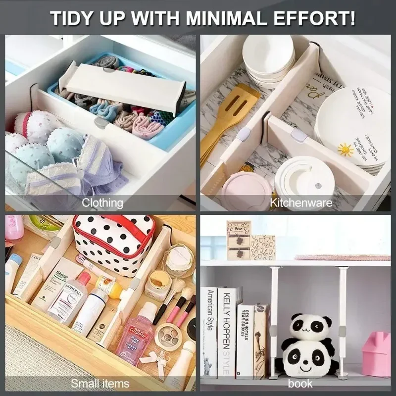 Mantenha suas gavetas, estantes e armários sempre organizados com o Divisor de Gaveta Retrátil com Trava.